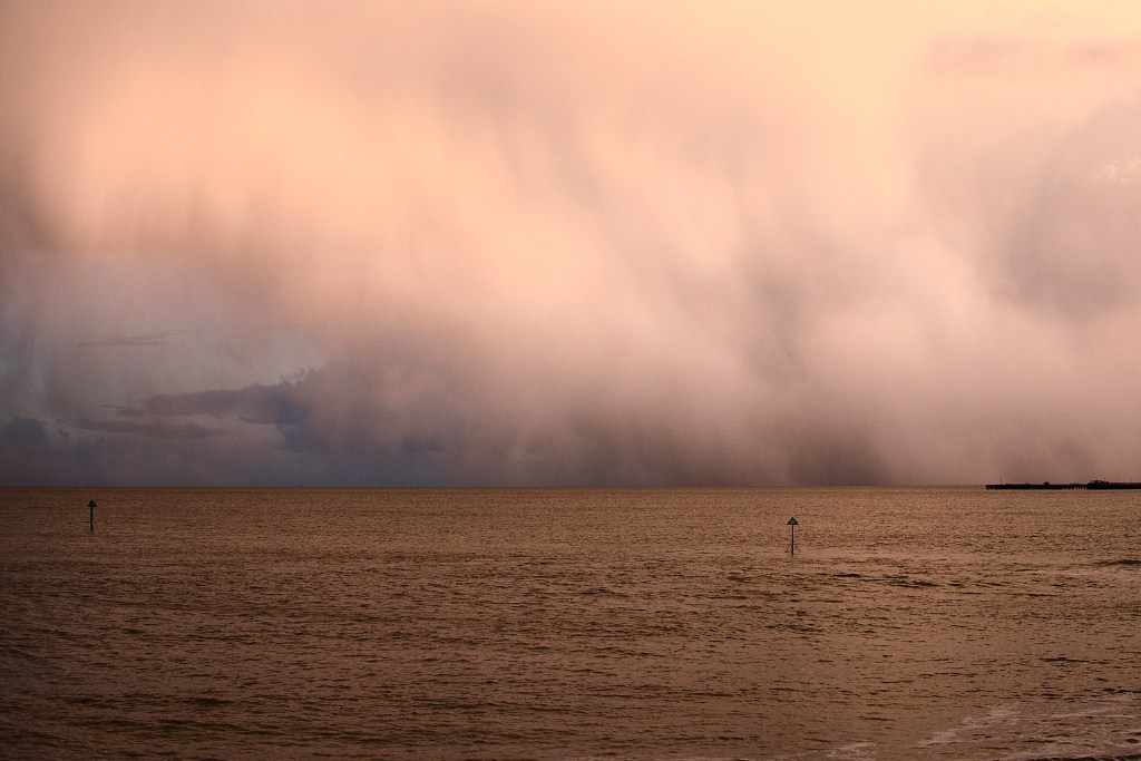 We left Harwich through Little Oakley and Great Oakley, and from the higher Walton Road we could see the grey North Sea beyond Kirby Creek, Horsey Island, and The Twizzle. The remains of a great storm in the buffeting wind and in the massing clouds. Walton Road became Kirby Road as it swept below Hamford Water Nature Reserve, and on to Walton on the Naze. Past a small funfair and suburban houses so close to the sea. I know its cold outside but in the warm pale glow of the setting sun over Frinton, I pull over to watch the storm clouds illuminated in pink. In the darkness thought Weeley and Hare Green and on to Colchester for Southend and a funeral tomorrow.